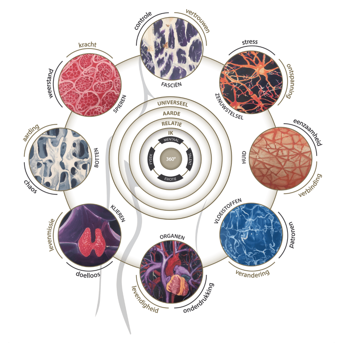 Wat gevoeld, gedacht, ervaren wordt in het leven, is terug te voelen in het lichaam. Daarbij staat het lichaam centraal. Het lichaam is een complex instrument en daarom delen we het in Bodyspirit in 8 lagen. Via een doorgedreven en uitgewerkte vorm van proprioceptie, interoceptie, visceroceptie en neuroceptie exploreren we die 8 lagen van ons lichaam: botten, spieren, organen, fascia, vloeistoffen, endocriene klieren, zenuwstelsel en de huid. Hierdoor leren we hun specifieke mogelijkheden en kwaliteiten te benutten om zelf aan het stuur te zitten, keuzes te maken, om te gaan met emoties, om te gaan met stress etc…